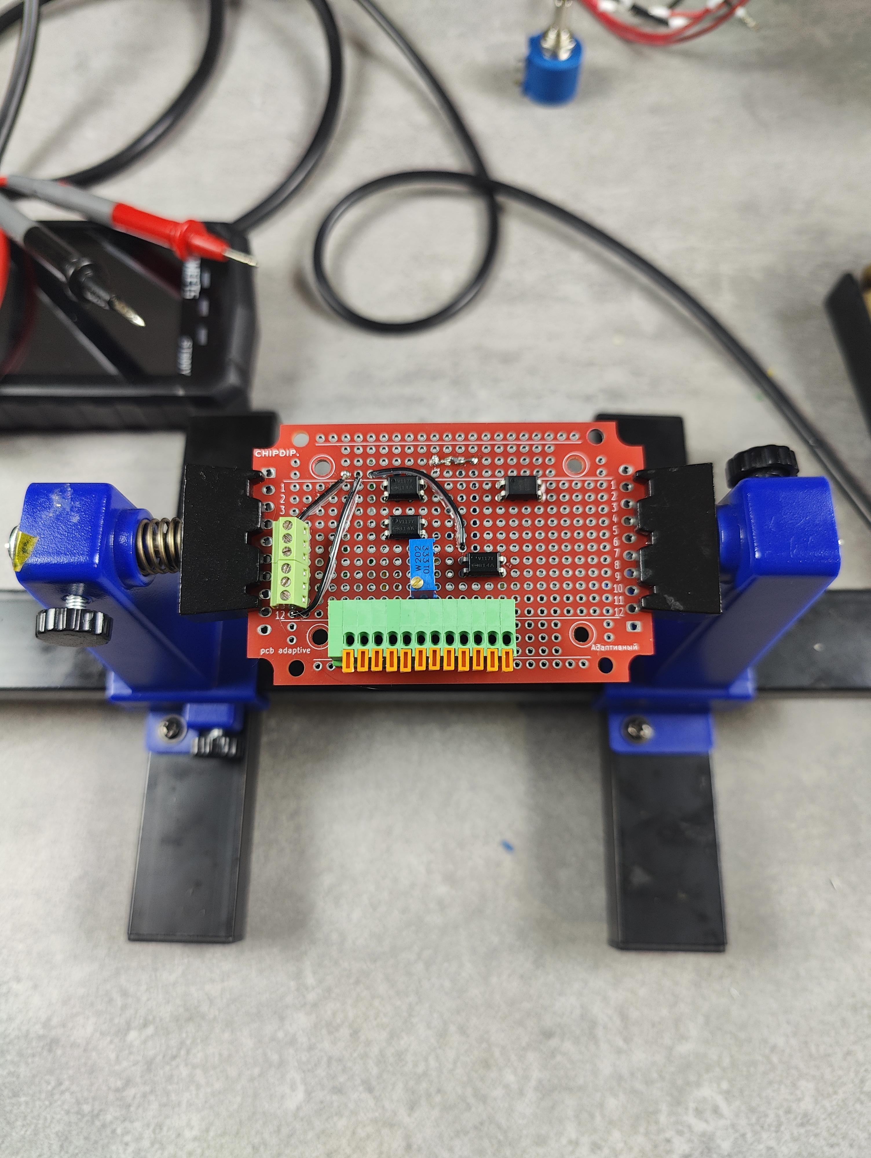 Пришлось проявить смекалку, вспомнить схемотехнику, каким образом разводить и паять самопальные платы. В результате смастерил небольшую плату, которая практически целиком состояла из нескольких оптронов.