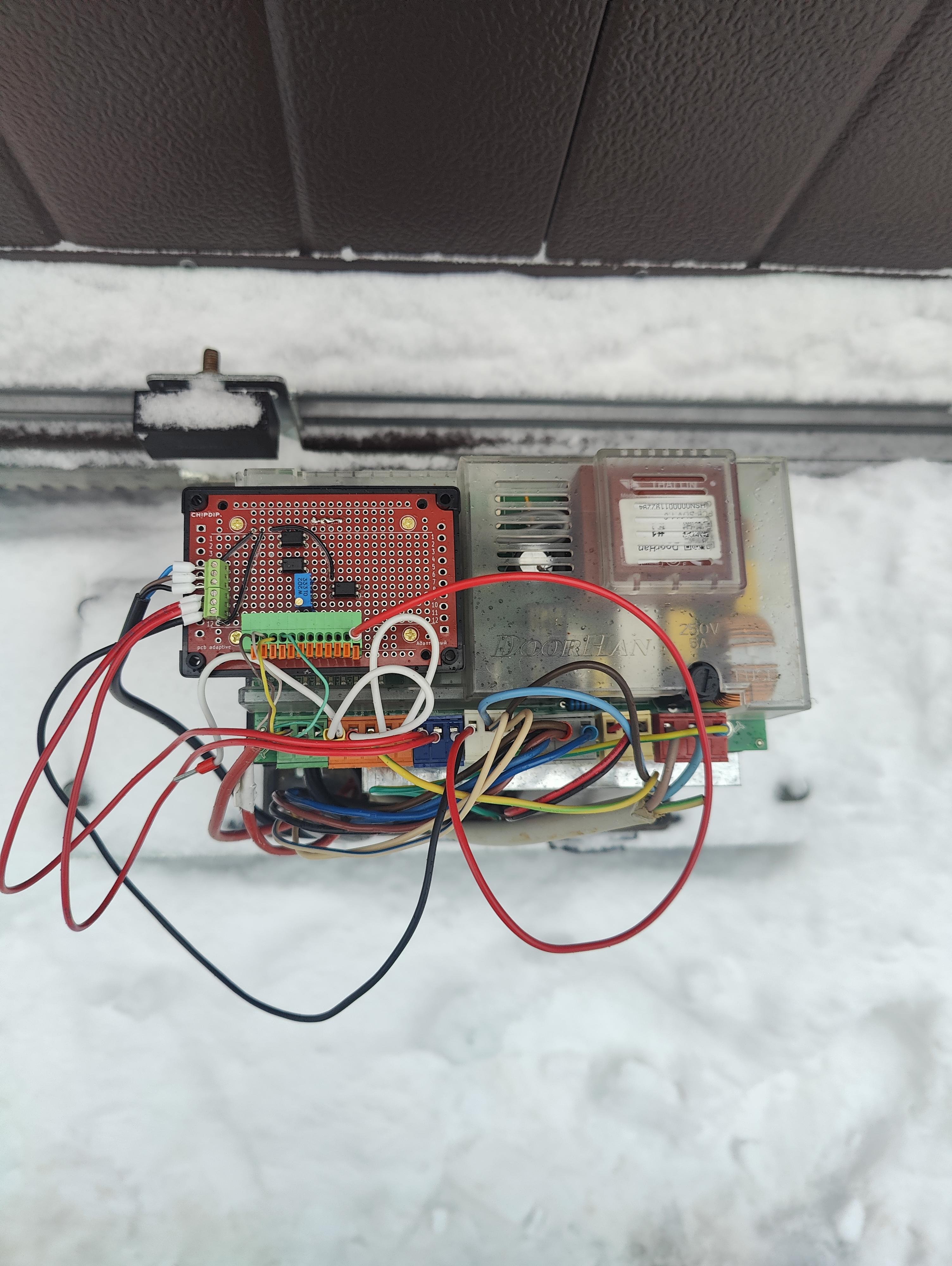 К ней были подключены провода от герконов (датчиков открытия), которые размещены в начале и конце ворот: таким образом мы знаем когда ворота открыты, а когда закрыты. Ещё один провод от платы отвечал за мигание лампочки, когда ворота находятся в движении. Так я получил понимание, когда ворота двигаются. Ну и наконец подключился к датчикам препятствия: теперь знаю, когда в воротах что-то есть.